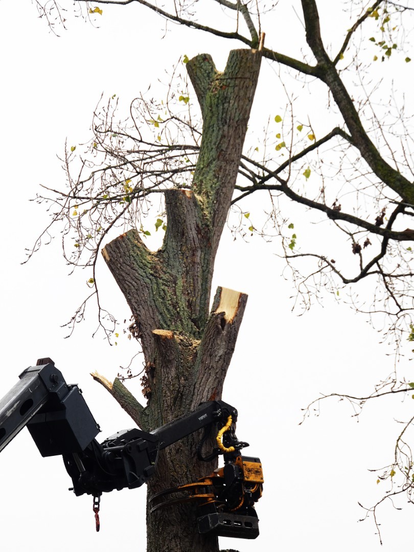 De klemmen hechtten zich om de top van de kruin en daarna was het tijd om met geweld de boom een paar keer heen-en-weer te schudden. De bovenkant van de boom wankelde. Ik zag dat de openingen bij de zaagsneden steeds groter werden.